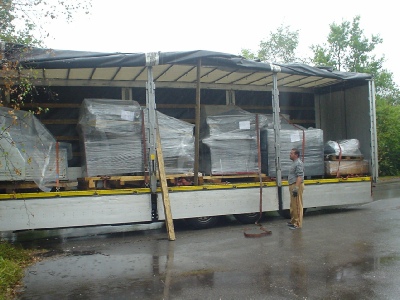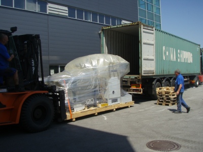 Nach Konservierung mit geeigneten Chemikalien wird die Maschine auf passenden Maschinenböden oder Holzrahmen befestigt, in Folie eingeschlagen und sicher im Container oder auf Flatrack verstaut.